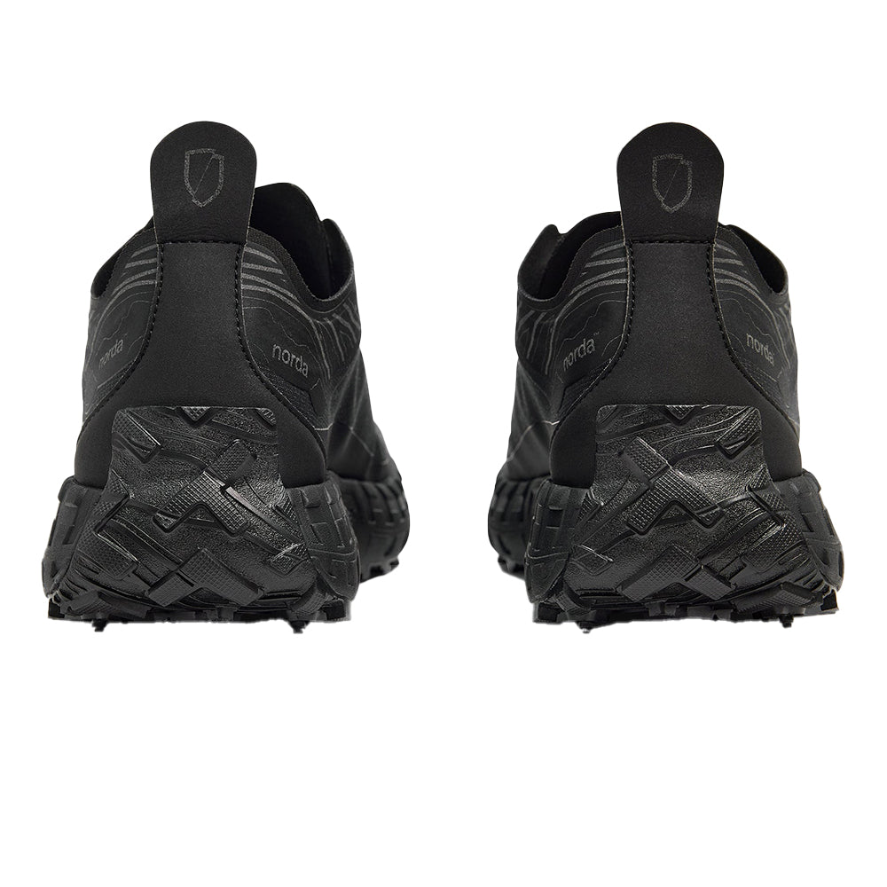 The norda 001A Stealth Black with a G+ Graphene water-resistant membrane. The Stealth Black features the world's first and only bio-based black Dyneema® the world's strongest and lightest fibre. The all-black upper is lined with a G+® graphene membrane, water-resistant to 10,000mm for additional warmth and dryness, all while remaining highly breathable. The ultimate all-weather training tool.