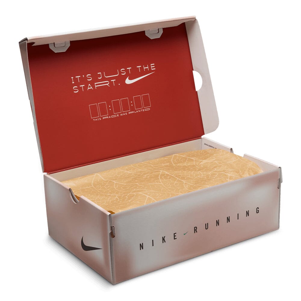 - Keep Growing: Whenever someone trains with Eliud Kipchoge, they're asked to plant a tree at his base camp to signify their growth. The sockliner graphics mimic that growth with branches moving forward towards the front of the shoe. The red clay color fade nods to the Kenyan dirt that stains the shoes when training. The font is a play on African trees that have fractal-like patterns on the surfaces.